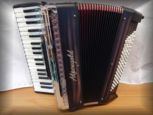 Balgrahmen mit Kerbschnitzerei, Balg Dirndlstoff blau